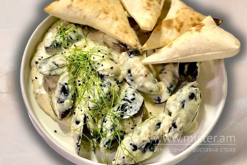 Мідії в мушлі в сирному соусі