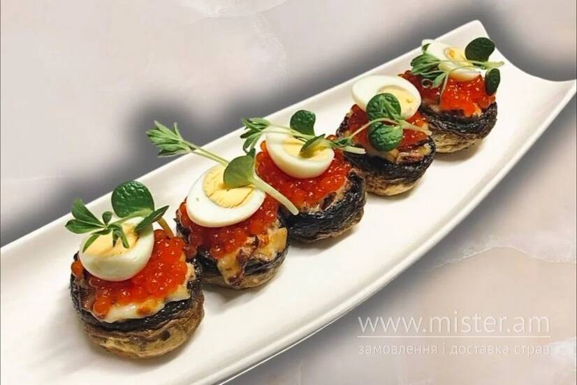 Запечені печериці, фаршировані беконом та сиром з червоною ікрою та перепелиним яйцем.