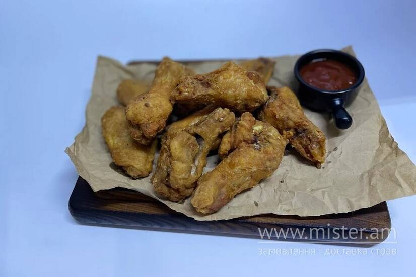 Хрусткі курячі крильця обсмажені у фритюрі з соусом Сацебелі.