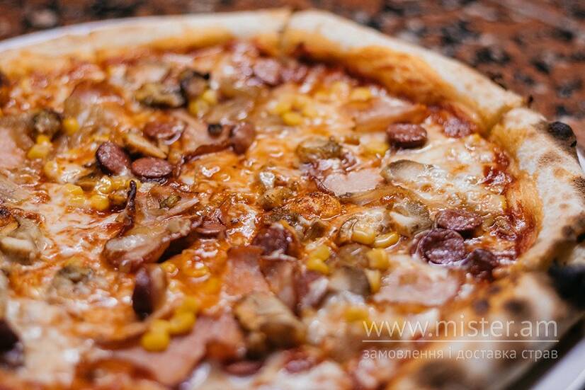 Курка, тушкована цибуля, вершковий соус, сир Моцарела, шинка копчена, ковбаски мисливські.