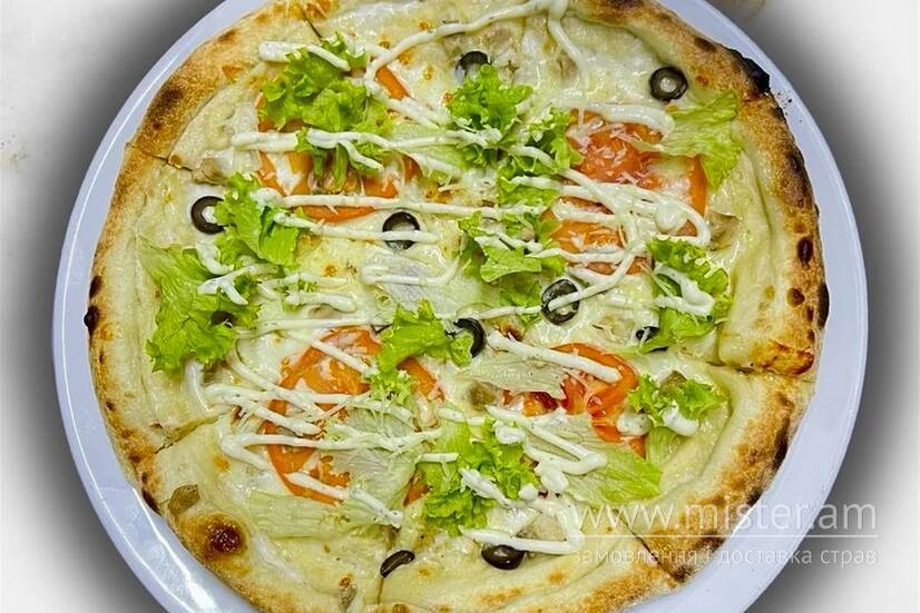 Курка, помідор, листя салату, оливки, сир Пармезан, сир Моцарела, соус Цезар.