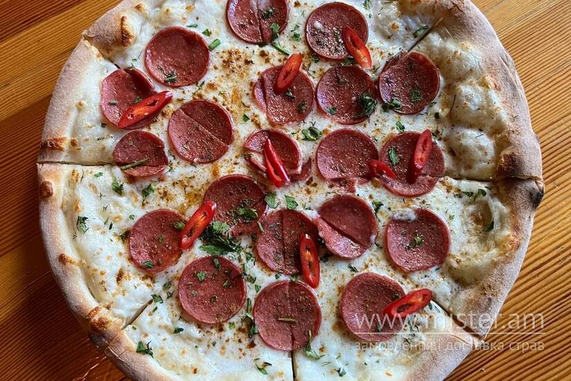 Ковбаса салямі італійська, перець чилі, соус Табаско, сир Моцарела.