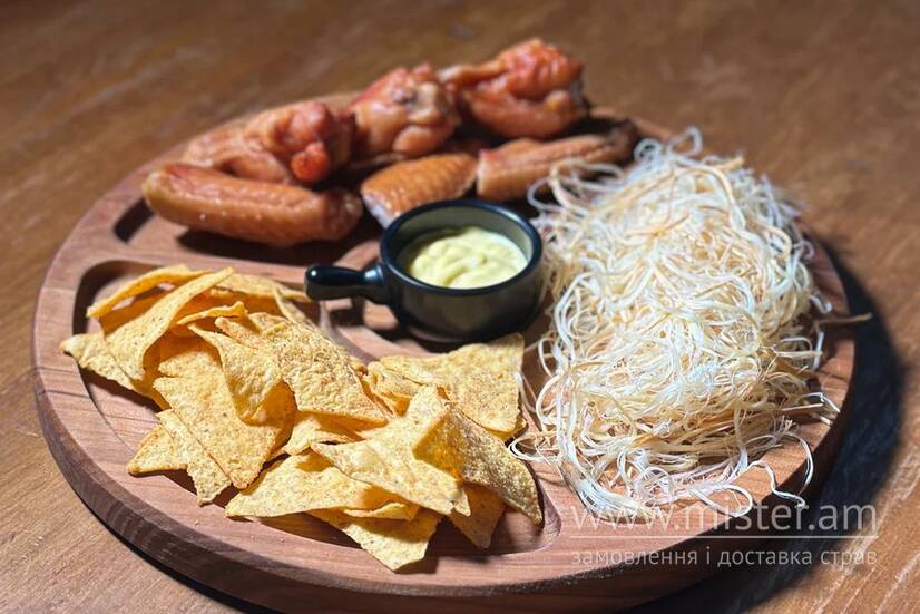 Курячі крильця копчені, сир Чечель, чіпси чітос, соус Сирний.