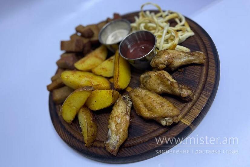 Курячі крильця, картопляні крокети з сиром, сухарики, сир Чечель, соус Тар-Тар, кетчуп.