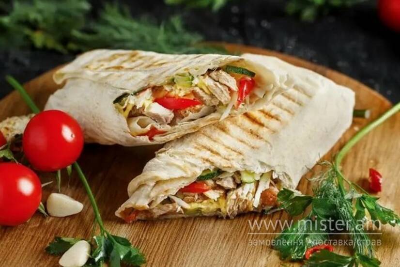 Лаваш, м`ясо, картопля фрі, овочі, фірмові соуси.