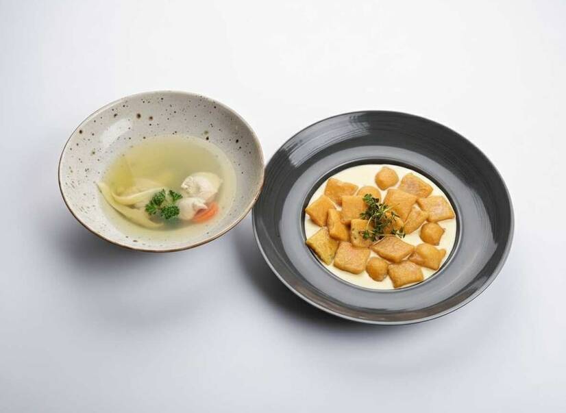 Куряче консоме та равіолі з куркою та броколі