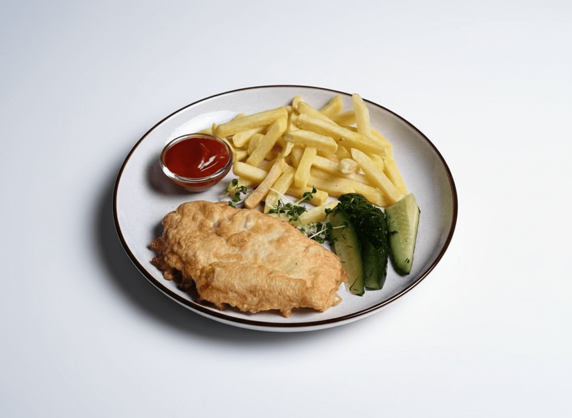 Відбивна з грибами та сиром подається з маринованими огірками та кетчупом