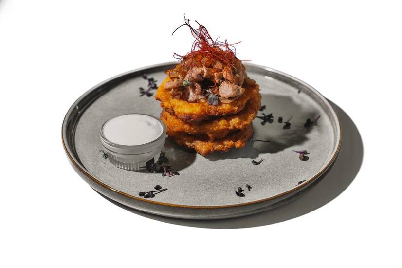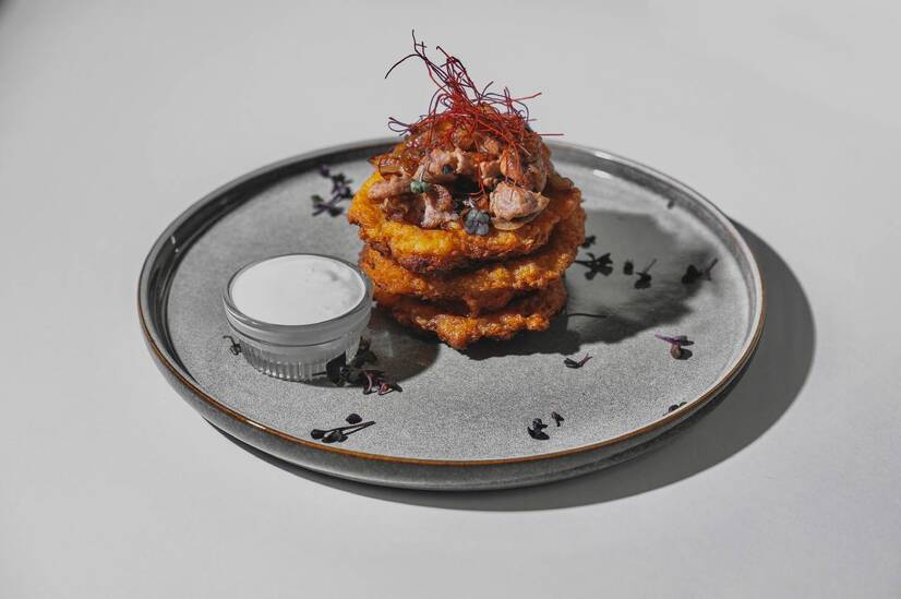 обсмажена свинина з цибулею,з хрусткими дерунами,подається з сметаною