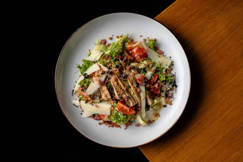 Листя салату, запечена індичка, томат, бекон, сир пармезан, соус на основі майонезу