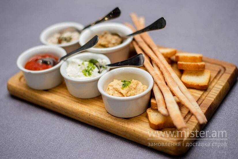 Ніжний курячий паштет, соус BBQ, сало з часником, сирний мус, хумус, грінки та палички грісіні.