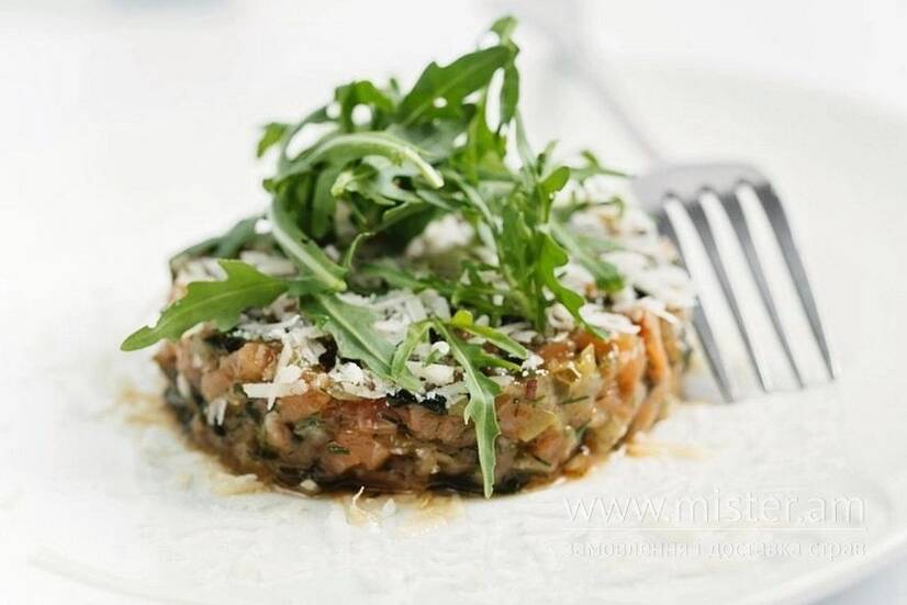 Шматочки свіжої сьомги, вакааме, синя цибуля, заправлені гірчичною та устрічною заправкою. Подається з пармезаном, руколою та грінками.