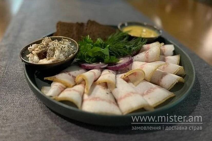 бочок,мелене сало,бородинський хліб,синя цибуля,запашна зелень та гостра гірчиця.