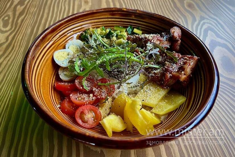 Курча, рис, пармезан, черрі, огірок свіжий, перець болгарський, яйця перепелині, фірмовий соус.