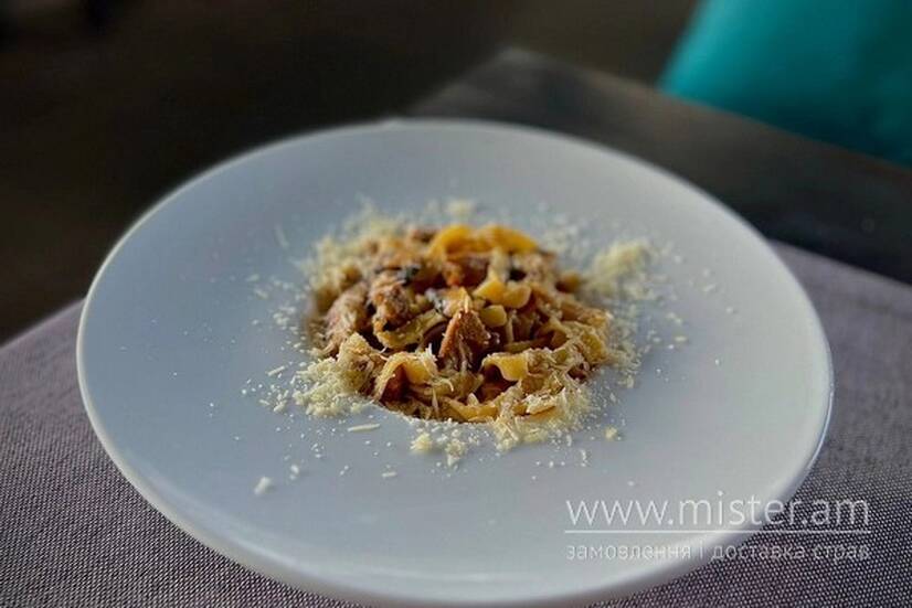 Феттучіні, телятина, пармезан, білі гриби, шампіньйони, соус демігляс.