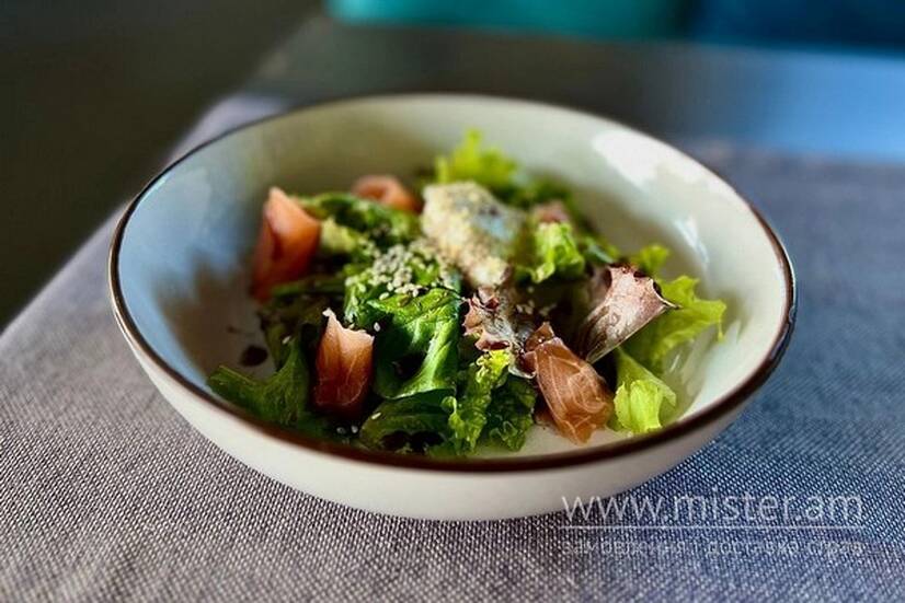 Сьомга, печериці свіжі, листя салату, сирний мус, водорослі вакаме, та рисова лапша, гірчично-медова заправка.