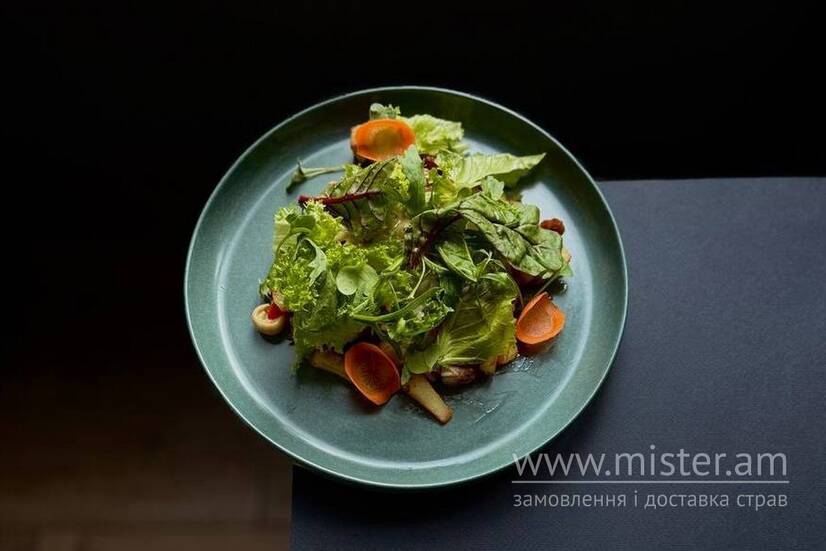 Куряче бедро, листя салату, перець печений, шпарагівка, маслини, оливки, гриби мариновані, запечена картопля, бочок, соус тар тар.