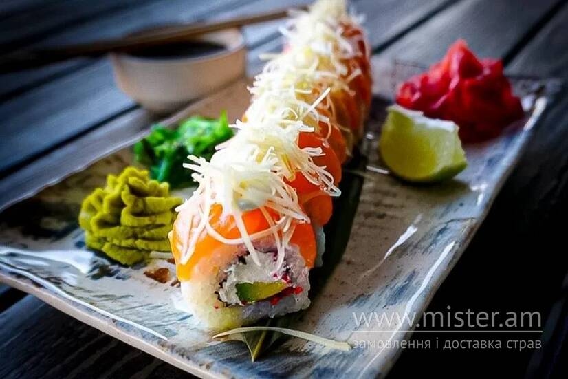 Рис, норі, лосось, крем-сир, авокадо, пармезан, ікра тобіко.