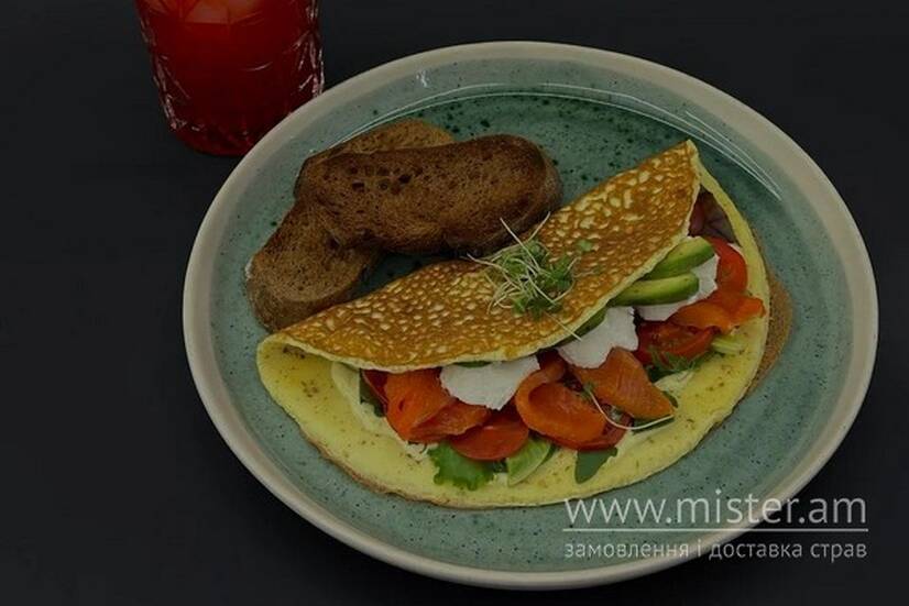 Яйця, лосось слабосолений, мікс салату, авокадо, чері, крем-сир, соус вершковий, мікрогрін.