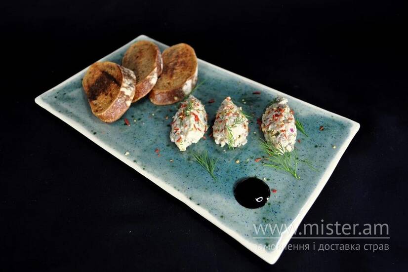 Оселедець Матіас, огірок маринований, цибуля синя, вершковий соус, бальзамічна глазур, хліб чорний.