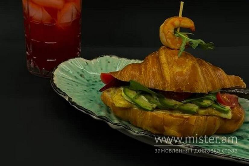 Круасан, креветки, яйце, авокадо, мікс салату, помідор чері, соус вершково-гірчичний.
