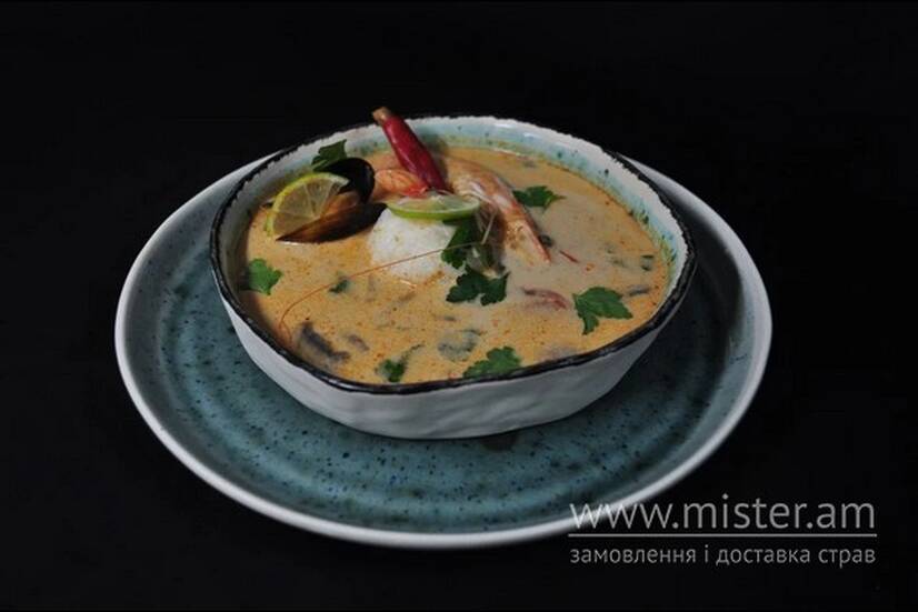 Бульйон Том Кха, кокосоке молоко, мідія, креветка, восьминіг бейбі, печериці, помідор чері, рис, петрушка, лайм.