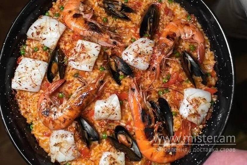 Рис арборіо, мідії, кальмари, креветки, горошок, перець болгарський, перець чилі, цибуля, шафран.