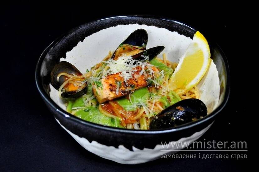 Макарони спагеті, мідії, філе лосося, шпинат, томатна пульпа, пармезан, лимон.