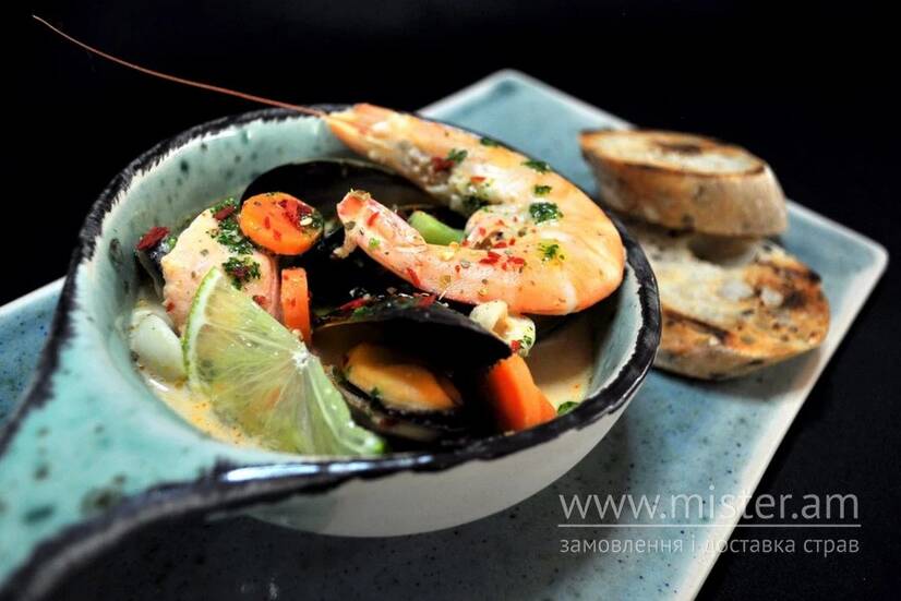 Броколі, бейбі морква, креветка, кальмар, мідії, філе лосося, вершки, лайм, хліб.