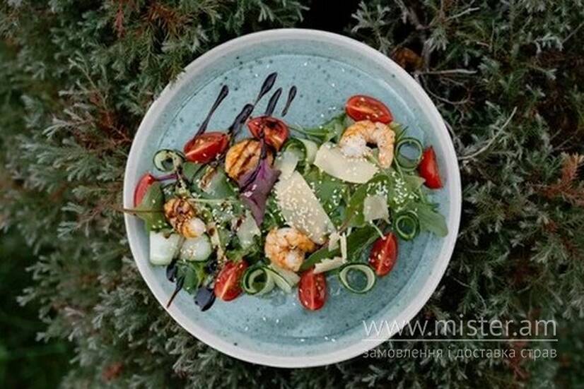 Мікс салату, помідори чері, огірки, сир пармезан, креветка смажена, кунжут білий, цитрусовий соус.