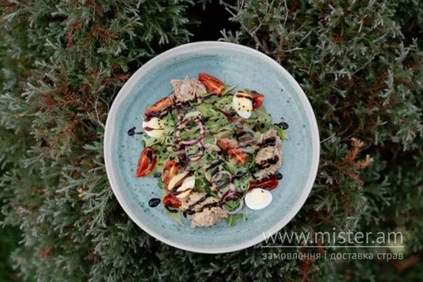 Мікс салату, помідори чері, яйця перепелині, цибуля синя, соус Унагі, насіння кунжуту чорне, заправка гірчична, тунець в олії.