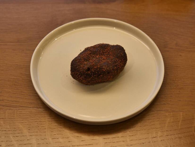 Крихта шоколадного бісквіту, крихта пісочного тіста поєднана з фундуком та грецьким горіхом. З додаванням червоного вина та рому. Всередині малинове конфі.