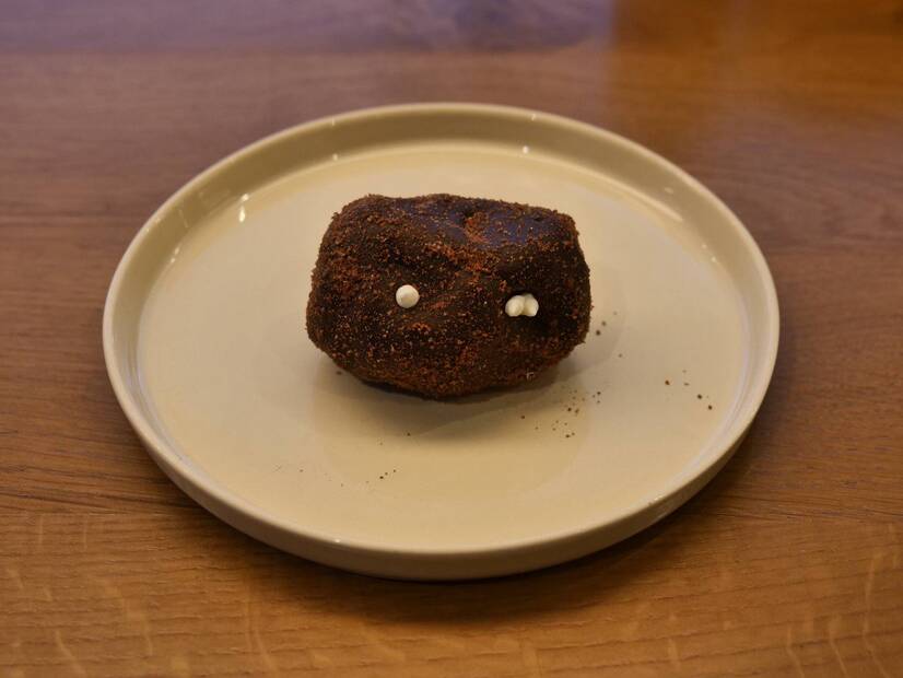 Крихта шоколадного бісквіту, крихта пісочного тіста поєднана з фундуком та грецьким горіхом. З додаванням червоного вина та рому.