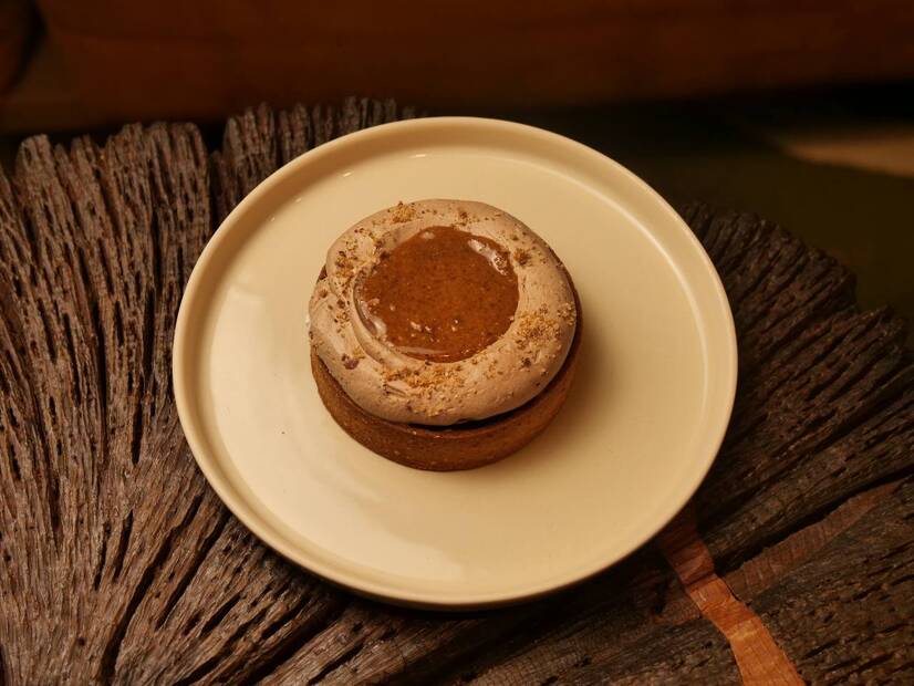 Хрусткий тарт з вершковою карамеллю та шоколадним брауні. Крем на основі темного шоколаду та горіхове праліне.