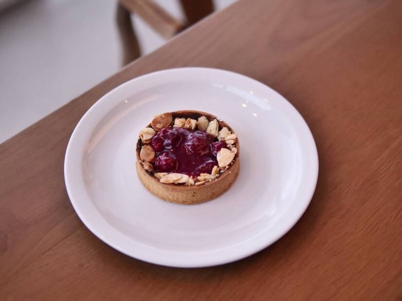 Хрустка пісочна основа, шоколадний ганаш, вишня і карамелізовані пластівці
