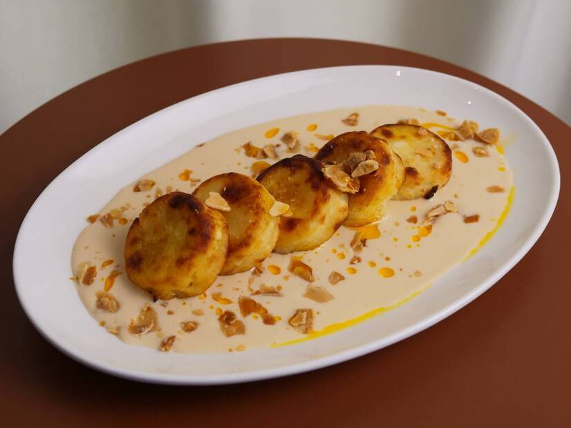 Ніжні сирники з кремом з ряжанки, мигдалевими пластівцяти та мандариновою олією.