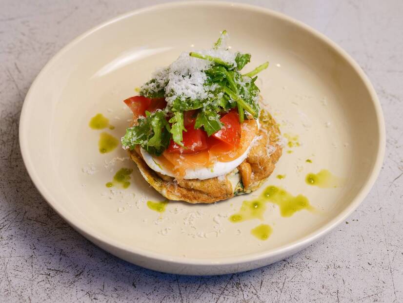 омлет з трьох яєць, лабне, слабосолений лосось, томати і рукола зі шпинатом. Посипається пармезаном.