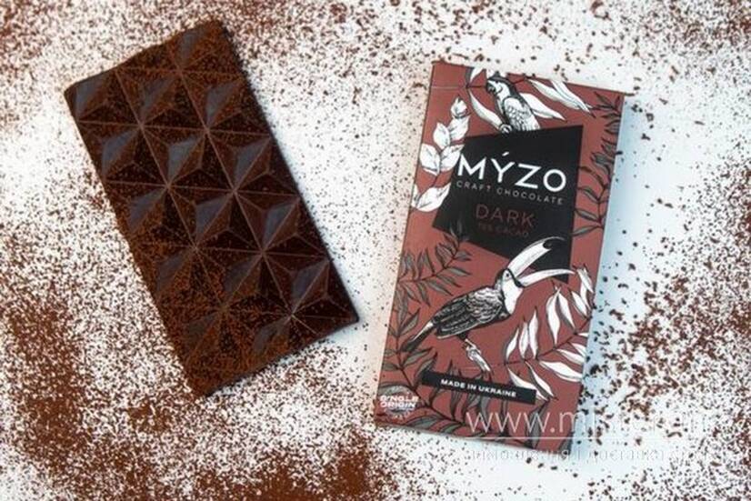 Чорний шоколад. Myzo Chocolate - це підприємство сім'ї ветерана, яке виготовляє шоколад із сортів какао Кріоло та Тринітаріо за принципом bean to bar: закуповуючи сировину безпосередньо у фермерів. Какао походить із Коста-Ріки, а виробничі потужності – в рідному Луцьку.