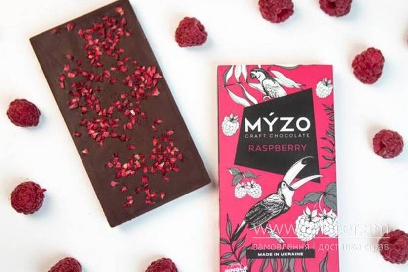 Шоколад з сублімованою малиною. Myzo Chocolate - це підприємство сім'ї ветерана, яке виготовляє шоколад із сортів какао Кріоло та Тринітаріо за принципом bean to bar: закуповуючи сировину безпосередньо у фермерів. Какао походить із Коста-Ріки, а виробничі потужності – в рідному Луцьку.