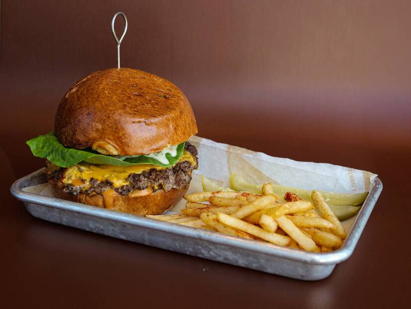 з двома яловичими котлетами, сиром чедер, маринованим огірком, цибулевим мармеладом, листям ромену та двома соусами - тартар та копчений бургерний соус. Подаємо з картоплею фрі і маринованим огірком