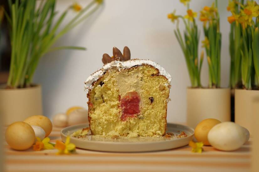 Крем на основі фісташкової пасти та вершкового сиру і полуничним креме.