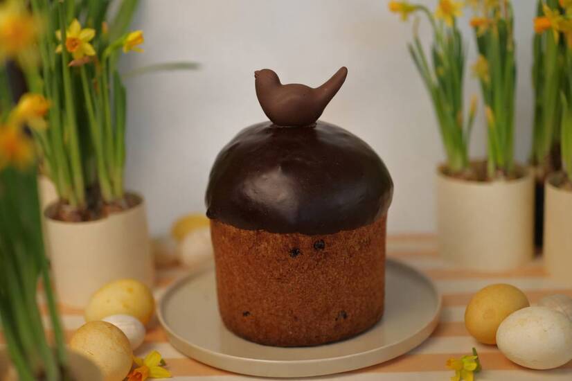 Пухка паска зі здобного тіста на основі яєць, борошна, дріжджів, масла, цукру та молока. Додаємо два вида родзинок та пряні цукати власного виробництва. Декоруємо шоколадною глазурʼю та шоколадною пташкою.