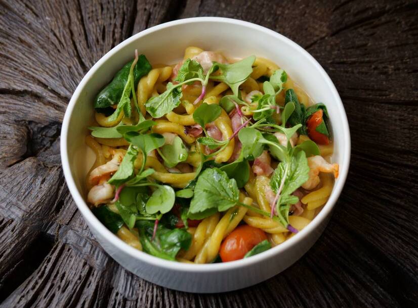 з вершковим маслом і вином. Доповнено курячим велюте, помідорами чері, шпинатом та зеленою олією.
