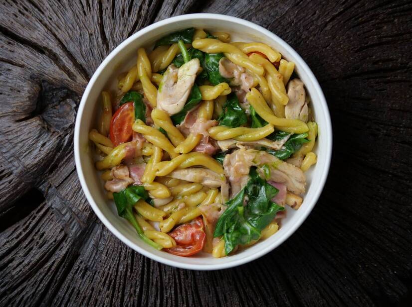 з вершковим маслом і вином. Доповнено курячим велюте, помідорами чері, шпинатом та зеленою олією.