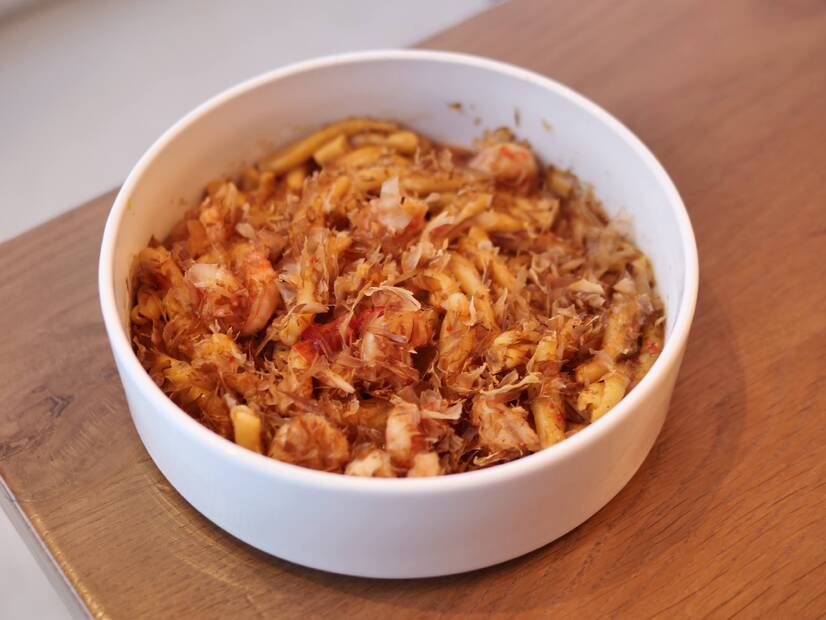 В поєднанні з овочевим велюте, ікрою тобіко. Пікантності додає азійська паста гочуджан.