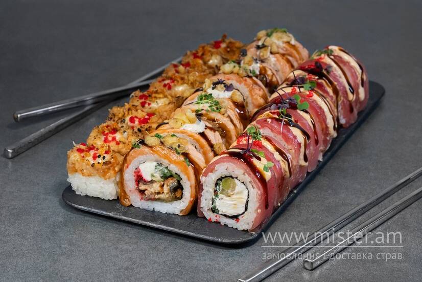 Рол з тунцем та чілі майо, кранч рол з лососем та вугрем, оші суші з обсмаженим лососем.