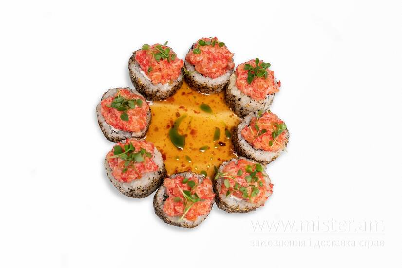 Рис, авокадо, огірок, тобіко, сніжний краб, крем-сир, фурікака, соус солодкий чілі, юзу.