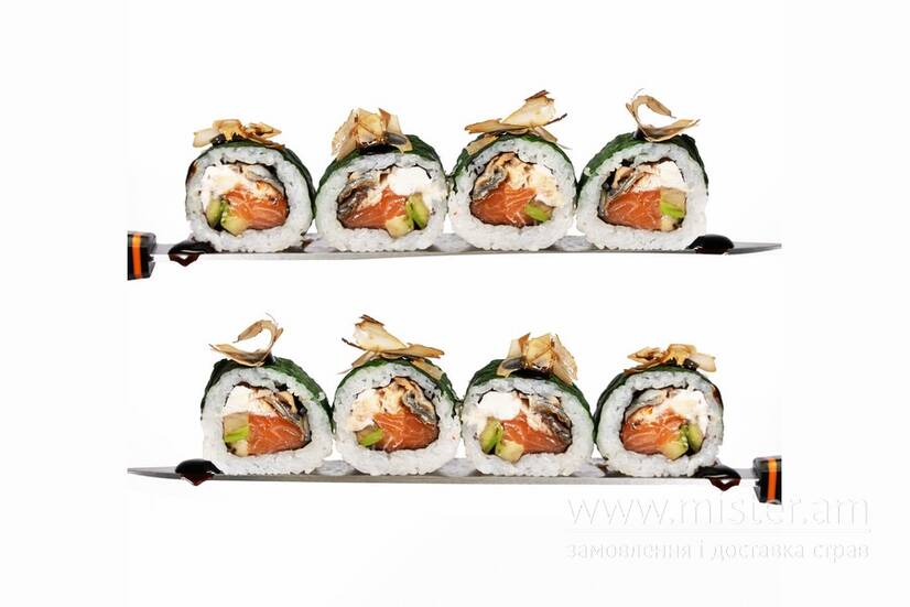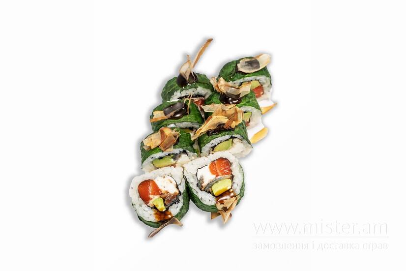 Рис, вугор, лосось, авокадо, крем-сир, шпинат, унагі, стружка тунця.