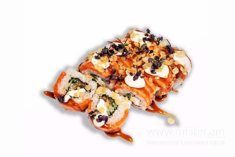 Рис, вугор, лосось, крем-сир, огірок, тобіко, кранч з темпури, трюфельний майонез, унагі.