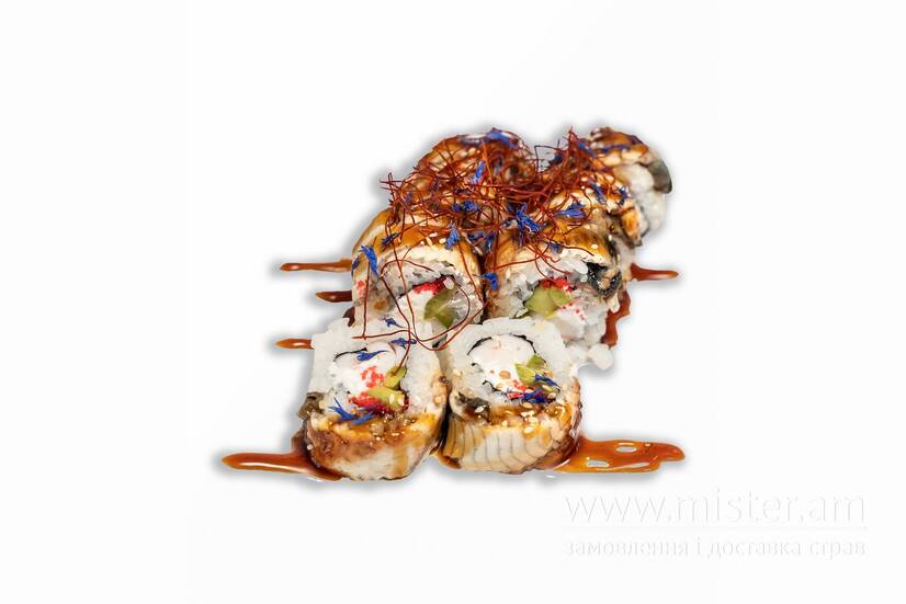 Рис, креветка, тобіко, авокадо, крем сир, вугор, унагі, кунжут, нитка чілі.