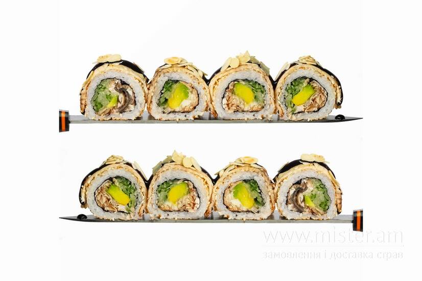 Подвійний вугор, авокадо, огірок, соус унагі, кунжут, мигдаль.